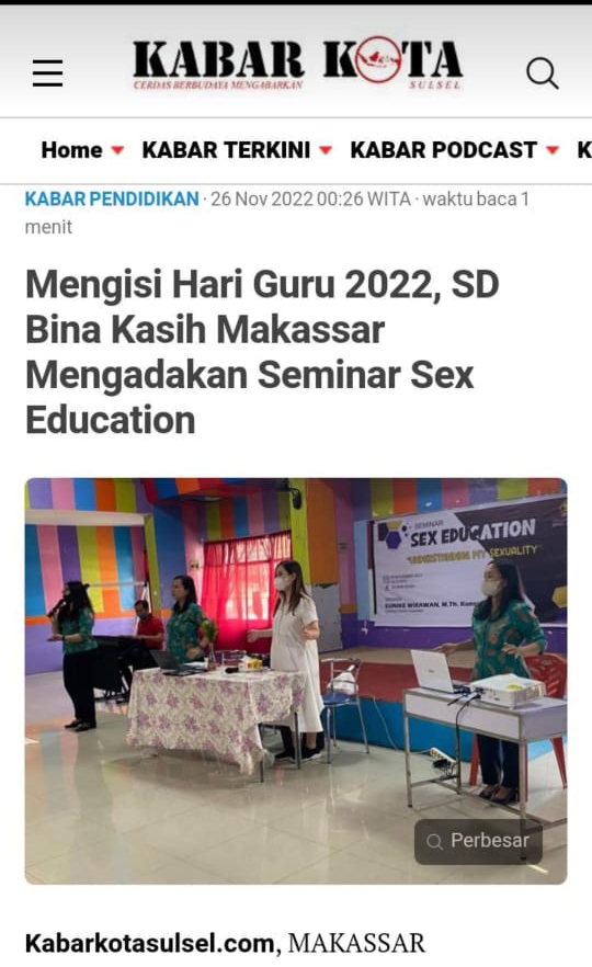 Mengisi Hari Guru, SD Bina Kasih Mengadakan Seminar Sex EducationMengisi Hari Guru (25/11), SD Bina Kasih mengadakan Seminar Sex Education. Pendidikan sex ini sebagai upaya untuk membagikan dan memberikan pengetahuan yang lebih